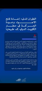 أعلنت الإدارة العامة للطيران المدني في الكويت، مساء اليوم، إعادة فتح المجال الجوي وعودة حركة الطيران في مطار الكويت الدولي إلى وضعها الطبيعي، وذلك بعد ساعات من الإغلاق الاحترازي الذي فُرض على خلفية التطورات الإقليمية الأخيرة.