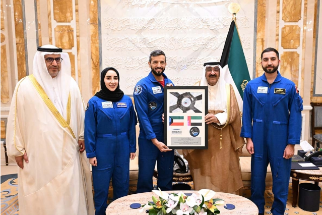 استقبل صاحب السمو أمير البلاد الشيخ مشعل الأحمد الجابر الصباح بقصر بيان صباح اليوم وزير الدولة لشؤون الشباب بدولة الإمارات العربية المتحدة الدكتور سلطان بن سيف النيادي ورائدي الفضاء نورة عيسى المطروشي ومحمد عبدالرحيم الملا وذلك بمناسبة زيارتهم للبلاد.