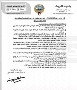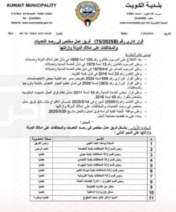 أصدرت مديرة بلدية الكويت المهندسة منال محمد العصفور القرار الإداري رقم (75 لسنة 2025)، بشأن تشكيل فريق عمل مختص برصد التعديات والمخالفات على أملاك الدولة البرية والبحرية، في جميع مناطق ومحافظات البلاد، بهدف تعزيز الرقابة الميدانية ورفع كفاءة التعامل مع هذه المخالفات.