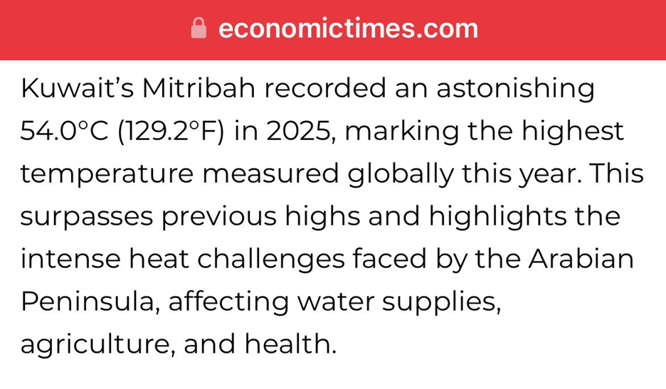 منطقة مطربة الكويتية سجّلت درجة حرارة مذهلة بلغت 54.0 درجة مئوية (129.2 درجة فهرنهايت) خلال صيف عام 2025، لتتربع بذلك على قائمة أعلى درجات الحرارة المسجلة عالميًا هذا العام.