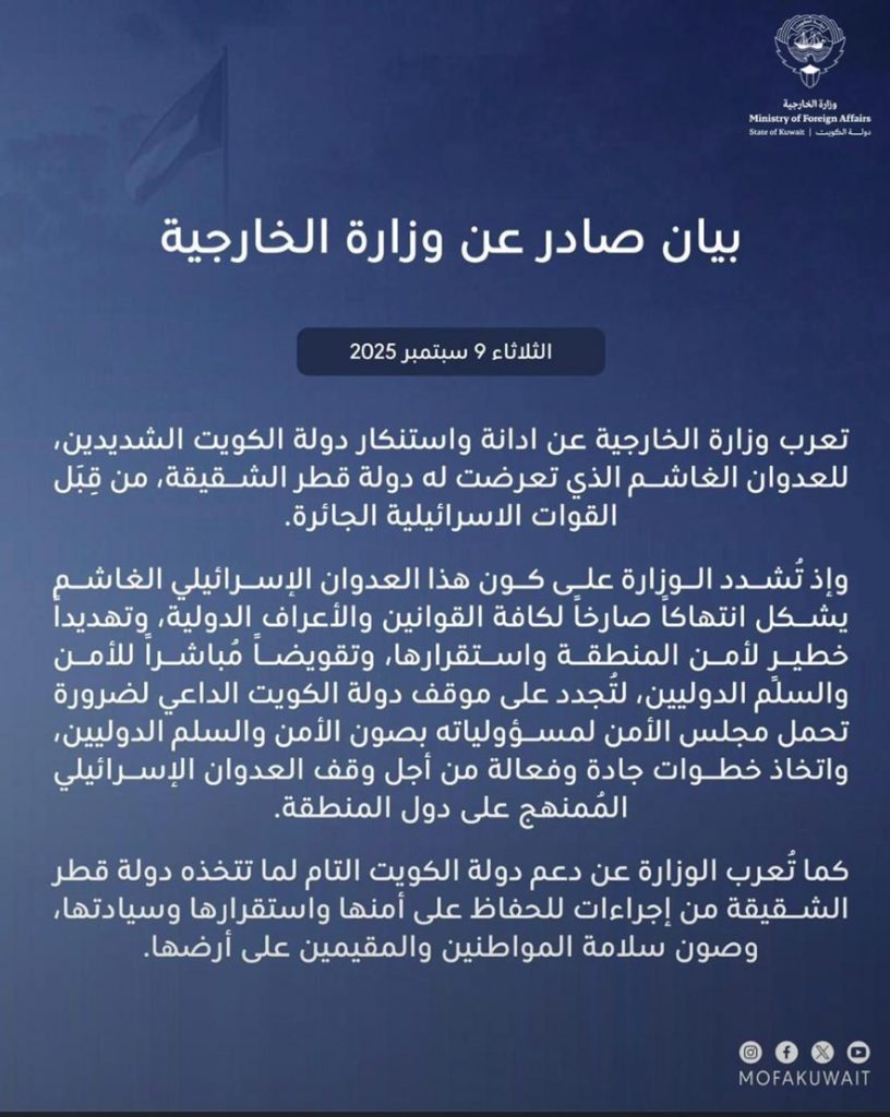 أعربت وزارة الخارجية الكويتية، عن إدانة واستنكار دولة الكويت الشديدين، للعدوان «الغاشم» الذي تعرضت له دولة قطر، من قِبَل القوات الإسرائيلية الجائرة. بالإضافة إلى ذلك، أكدت الوزارة أن هذا العدوان ينتهك القوانين الدولية ويهدد أمن واستقرار المنطقة.
