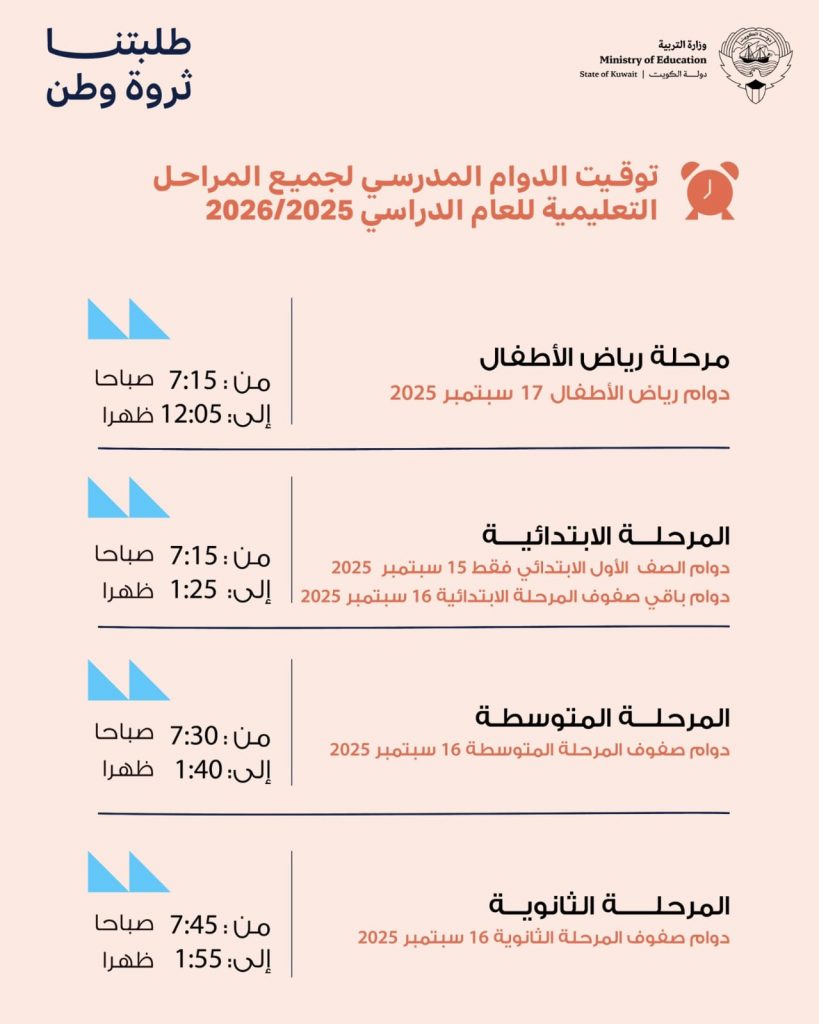 فيما يتعلق ببقية الصفوف الدراسية، يبدأ دوام المرحلتين الابتدائية والمتوسطة والثانوية غدًا الثلاثاء 16 سبتمبر، بينما تستقبل رياض الأطفال أبناءها يوم الأربعاء 17 سبتمبر. وبالتالي، فإن عملية العودة إلى المدارس تسير تدريجيًا وبشكل منظم، بما يضمن سهولة التكيف مع أجواء الدراسة. علاوة على ذلك، فإن هذا التوزيع الزمني يخفف الضغط على المدارس ويمنح أولياء الأمور والكوادر التعليمية فرصة أكبر لتنظيم الاستقبال.