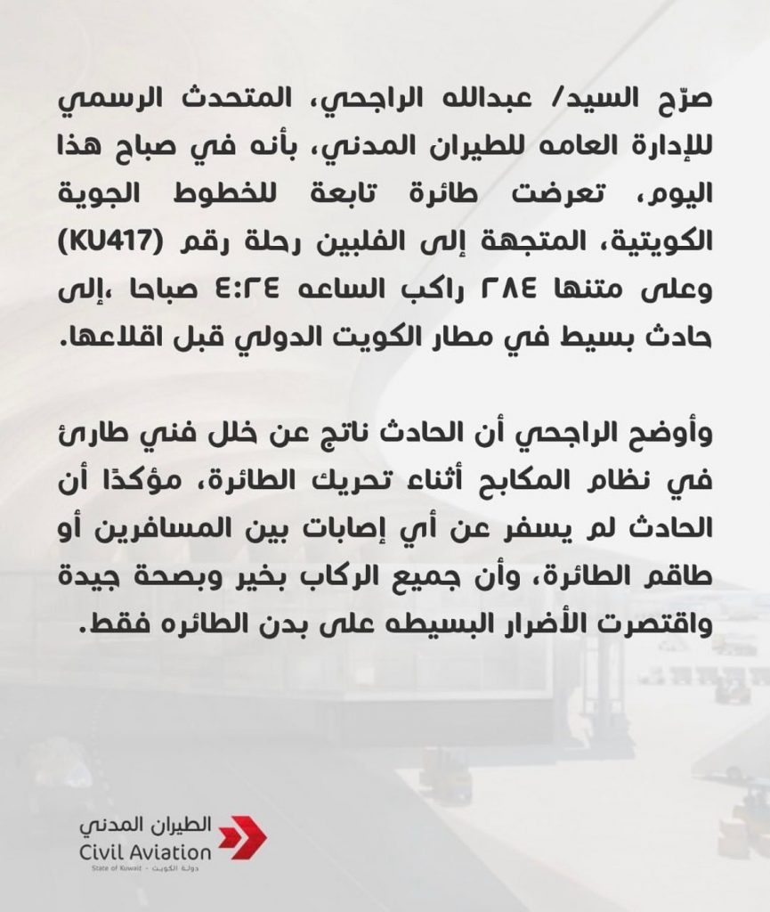 أعلنت هيئة الطيران المدني اليوم الجمعة عن حادث بسيط لطائرة تابعة للخطوط الجوية الكويتية في مطار الكويت الدولي.