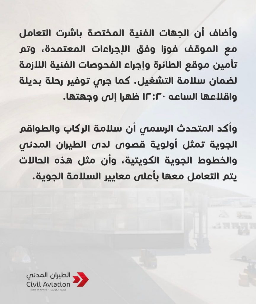 لذلك، تبقى الثقة بسلامة الطيران الكويتي قوية بفضل الاحترافية وسرعة الاستجابة في مواجهة الطوارئ.