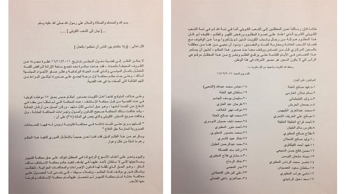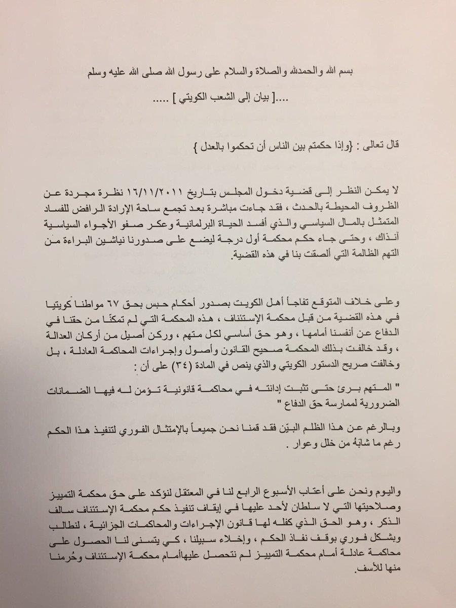 وأوضحوا أن حكم محكمة أول درجة جاء واضعا على صدورهم نياشين البراءة من التهم التي اُلصقت بهم، إلا انه على خلاف المتوقع أصدرت محكمة الاستئناف أحكاما بحبس 67 مواطنا، مؤكدين أن المحكمة لم تمكنهم من حقهم في الدفاع عن انفسهم وهو حق أساسي لكل متهم، وركن أصيل من أركان العدالة، معتبرين في بيانهم ان المحكمة خالفت صحيح القانون واصول واجراءات المحاكمة العادلة بل والدستور الكويتي الذي ينص على ان المتهم بريء حتى تثبت ادانته في محاكمة قانونية تؤمن له فيها الضمانات الضرورية لممارسة هذا الدفاع.
